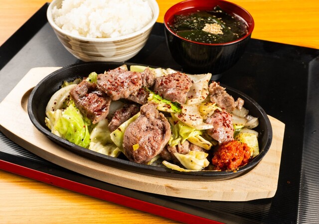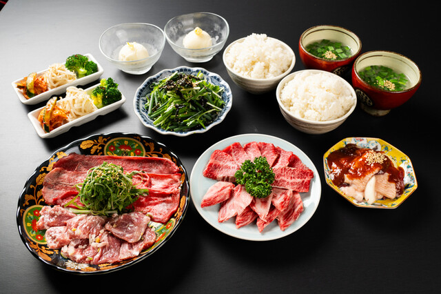・焼肉前菜3種 ・塩焼肉盛合せ(牛タン付き) ・ホルモン盛合せ(味噌) ・ライス(大盛無料) ・青ネギサラダ ・バラ焼きカルビ盛合せ(タレ) ・野菜たっぷりスープ ・シャーベット