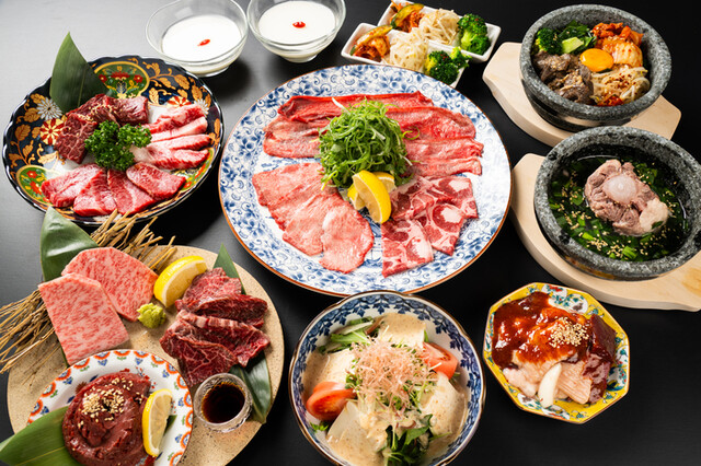 ・焼肉前菜3種 ・タン塩盛合せ ・和牛タレ焼肉3種盛合せ ・和牛テール肉煮込みスープ ・ミルク杏仁豆腐 ・おとうふサラダ ・塩焼肉3種盛合せ(和牛バラ入り) ・ホルモン盛合せ(味噌) ・石焼ビビンパ